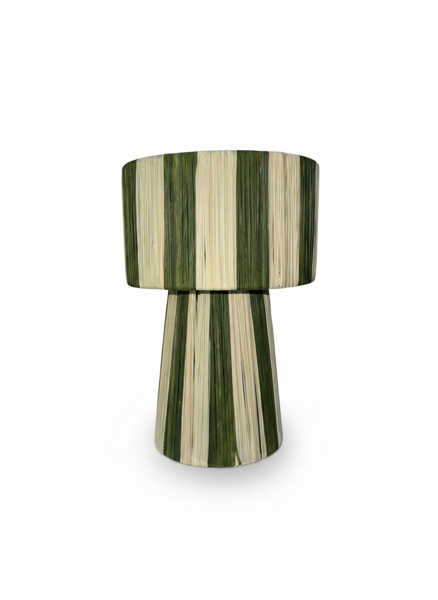 This handwoven raffia lantern is crafted using natural fibers and traditional weaving techniques inspired by Moroccan craftsmanship. Its harmonious green and natural striped design brings freshness and character while maintaining a refined, minimalist aesthetic.